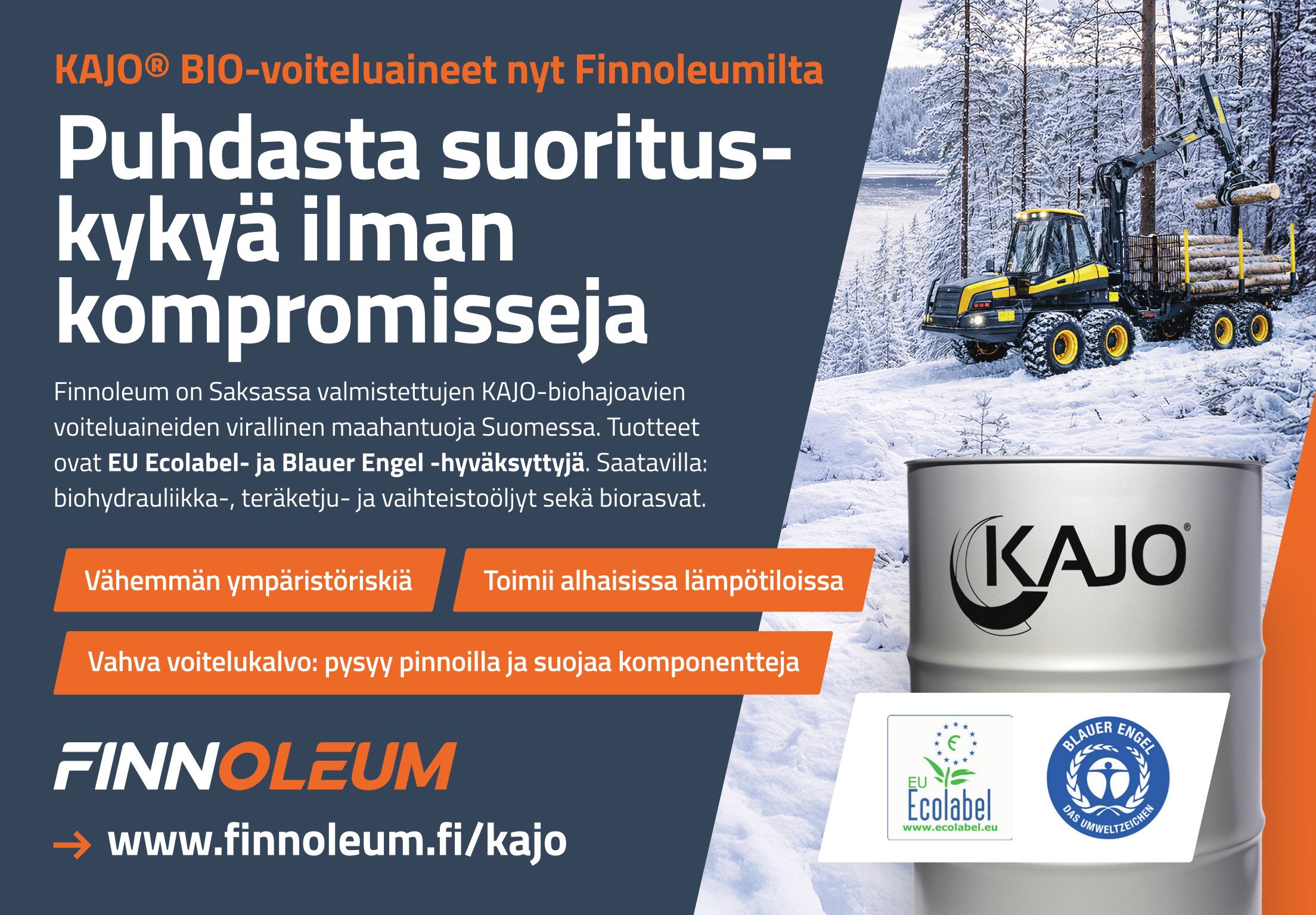 Finnoleum Oy on virallinen, saksalaisten KAJO biovoiteluaineiden maahantuoja Suomessa. Toimitamme laadukkaat EU Ecolabel ja Blauer Engel (blue angel) -hyväksytyt biohajoavat KAJO-voiteluaineet kaikkiin ympäristöherkkiin voitelukohteisiin.